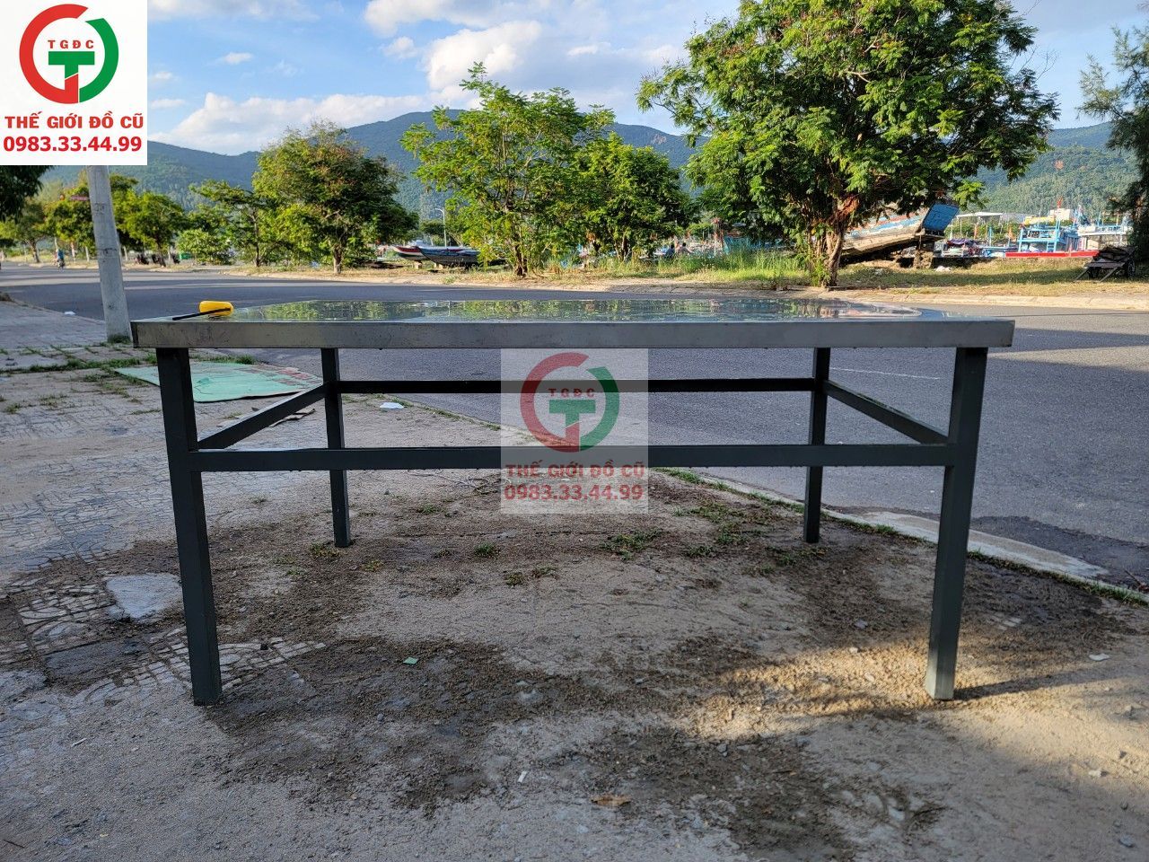 Thanh lý Bàn chế biến, sơ chế món bếp ăn quán xá, nhà hàng inox 304 chân sắt trụ V5 chắc cứng.