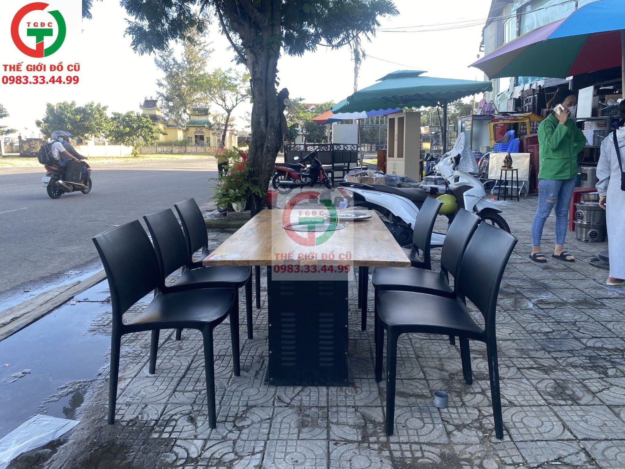 Set bàn 6 ghế nhựa đúc còn mới chắc, xếp chồng di chuyển dễ dàng.