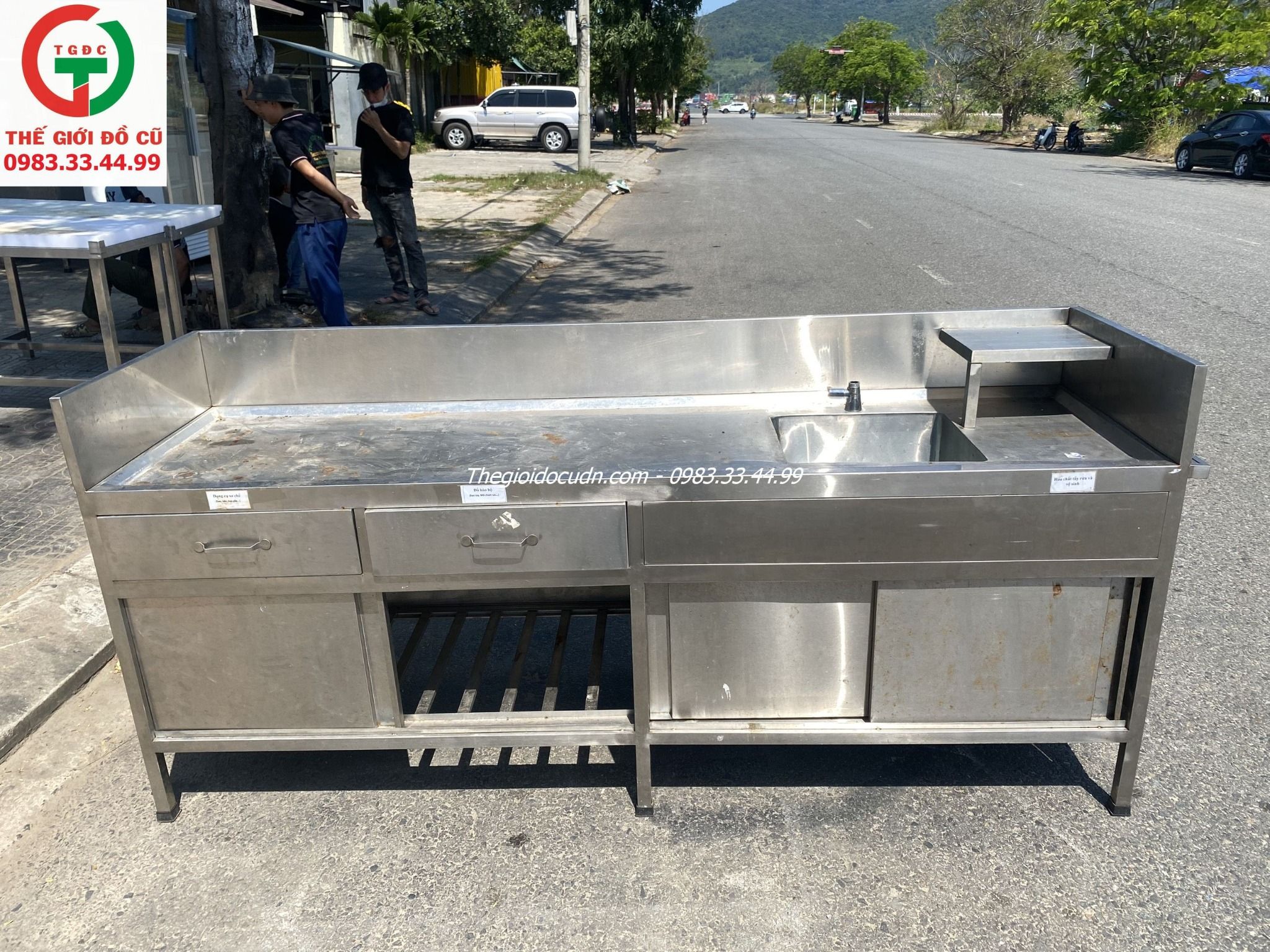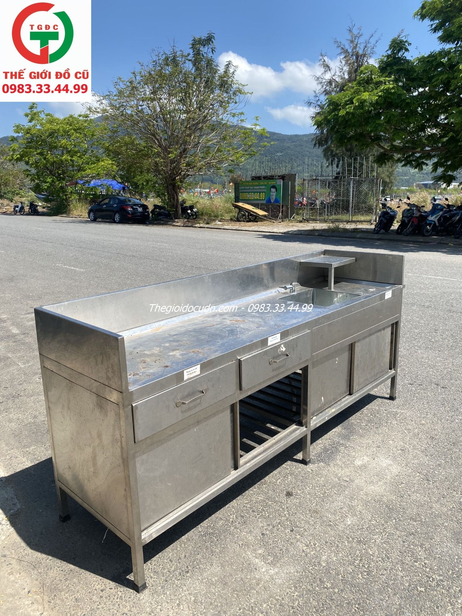 Bàn inox sạch sẽ, có ngăn hộc tủ phân cách, có chậu rửa tay.