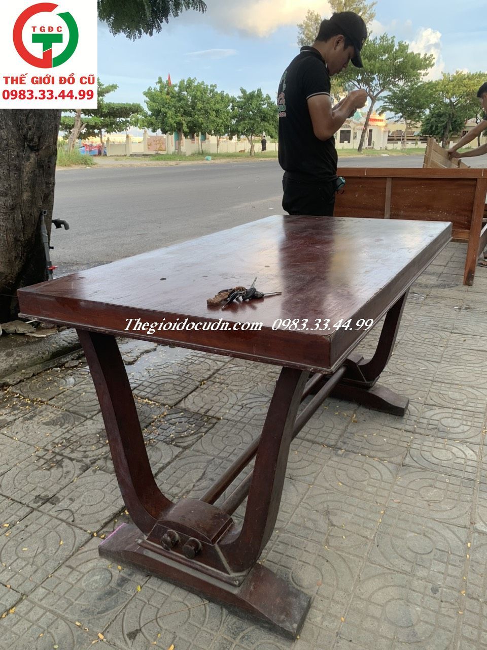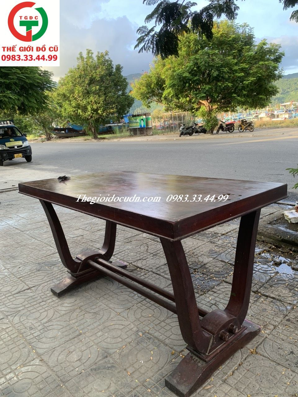 Thanh lý Bàn trà chân V gỗ xưa còn đẹp bóng màu PU cho AE kết hợp ghế ngồi uống trà tiếp khách hay setup bàn ăn nhà xưa, nhà hàng truyền thống..