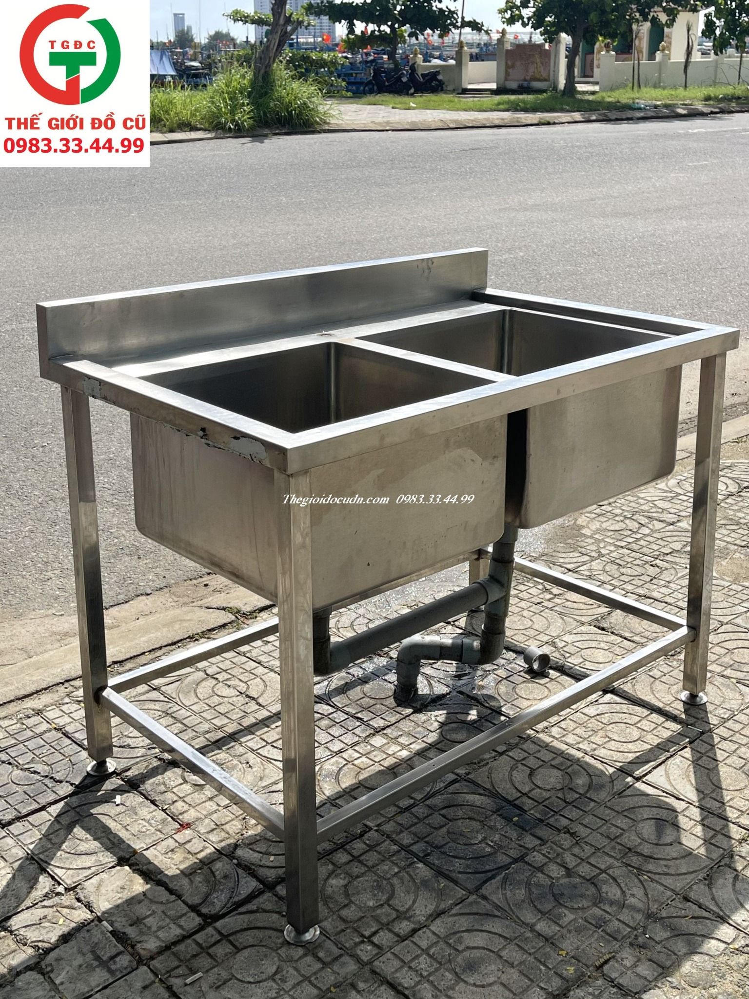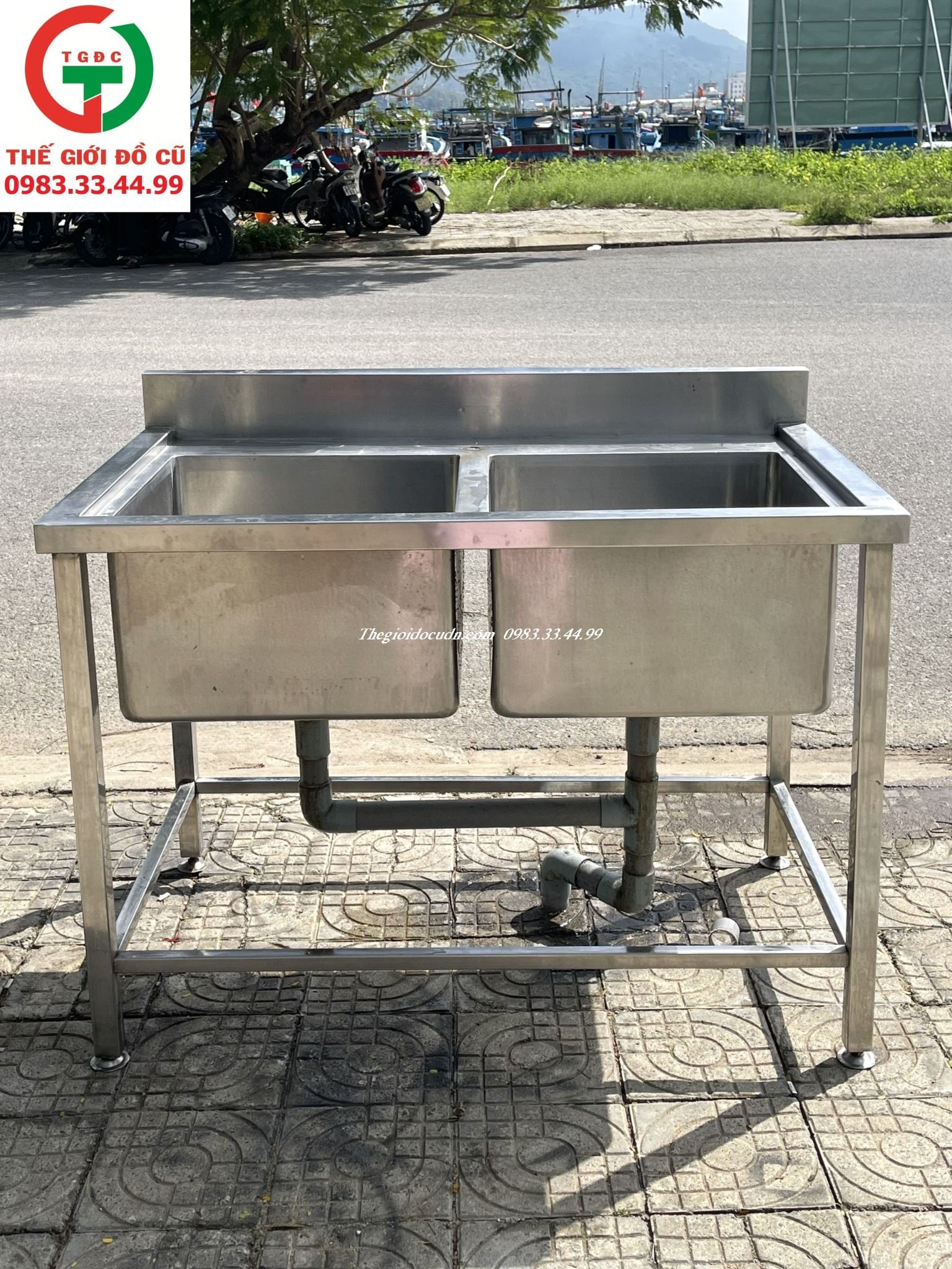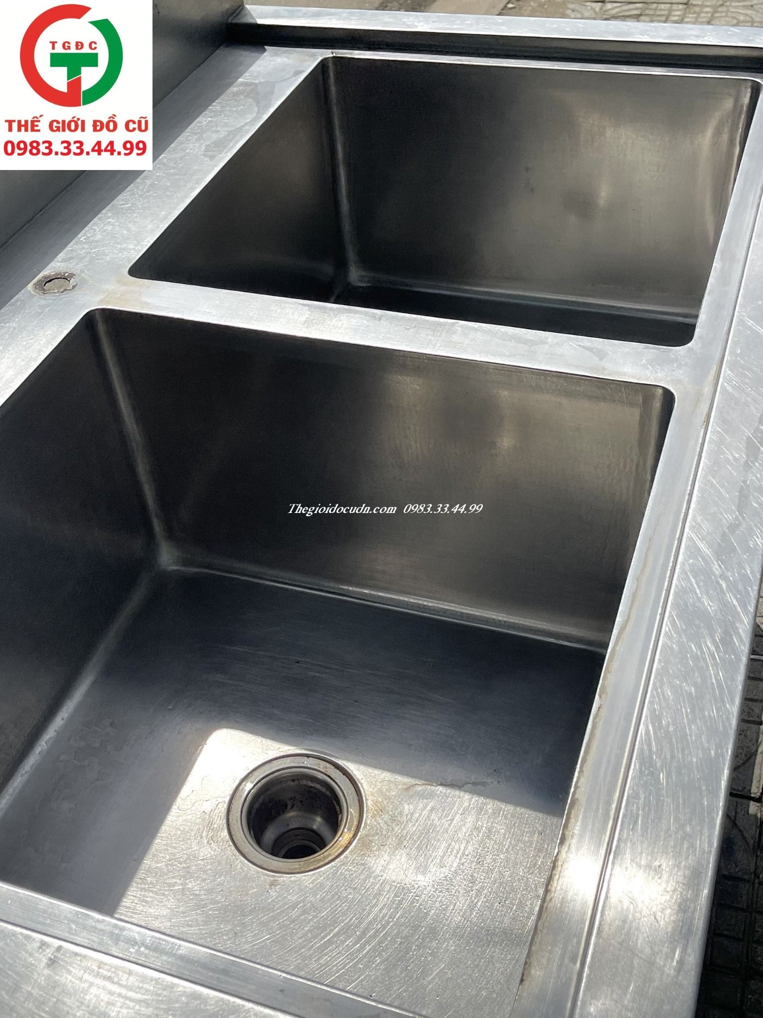 Thanh lý Chậu rửa inox 2 họng vuông còn mới dày cứng, sẵn ống lắp đặt quán xá, nhà hàng sử dụng rửa bền.