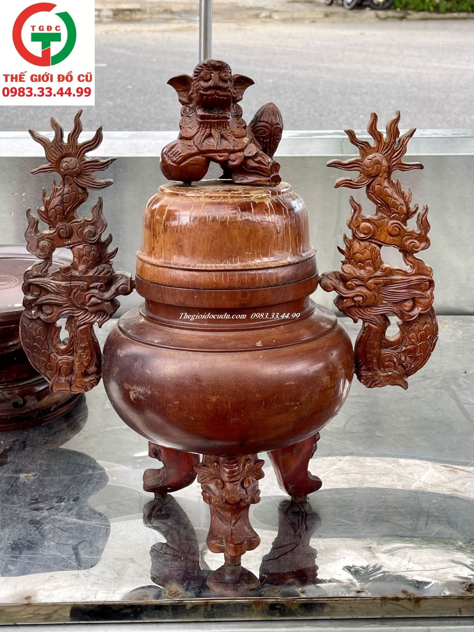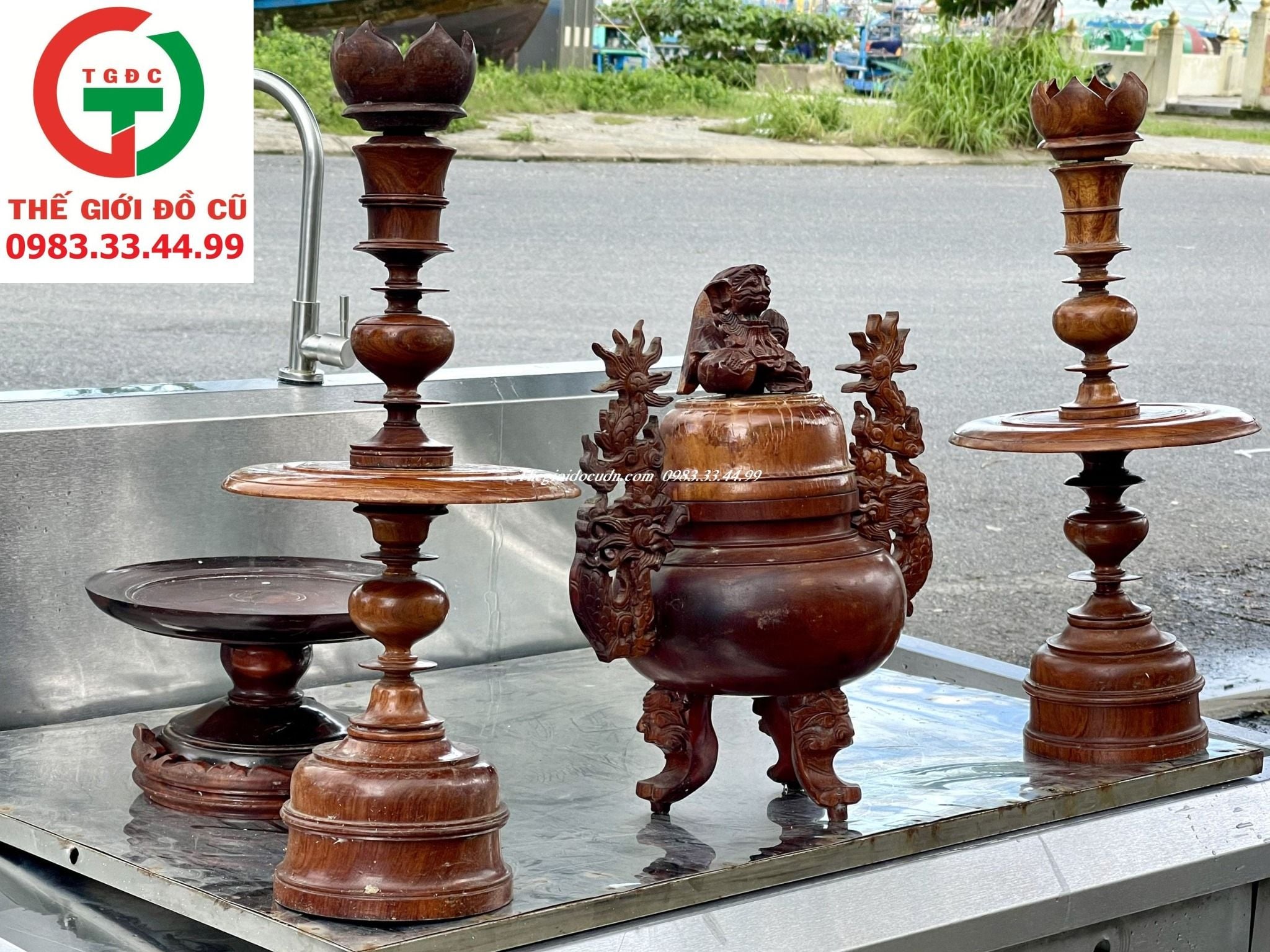 Thanh lý Combo Nồi hương - Đĩa và chân đèn gỗ tiện khắc đẹp sang cho gia đình setup ban thờ gia tiên.