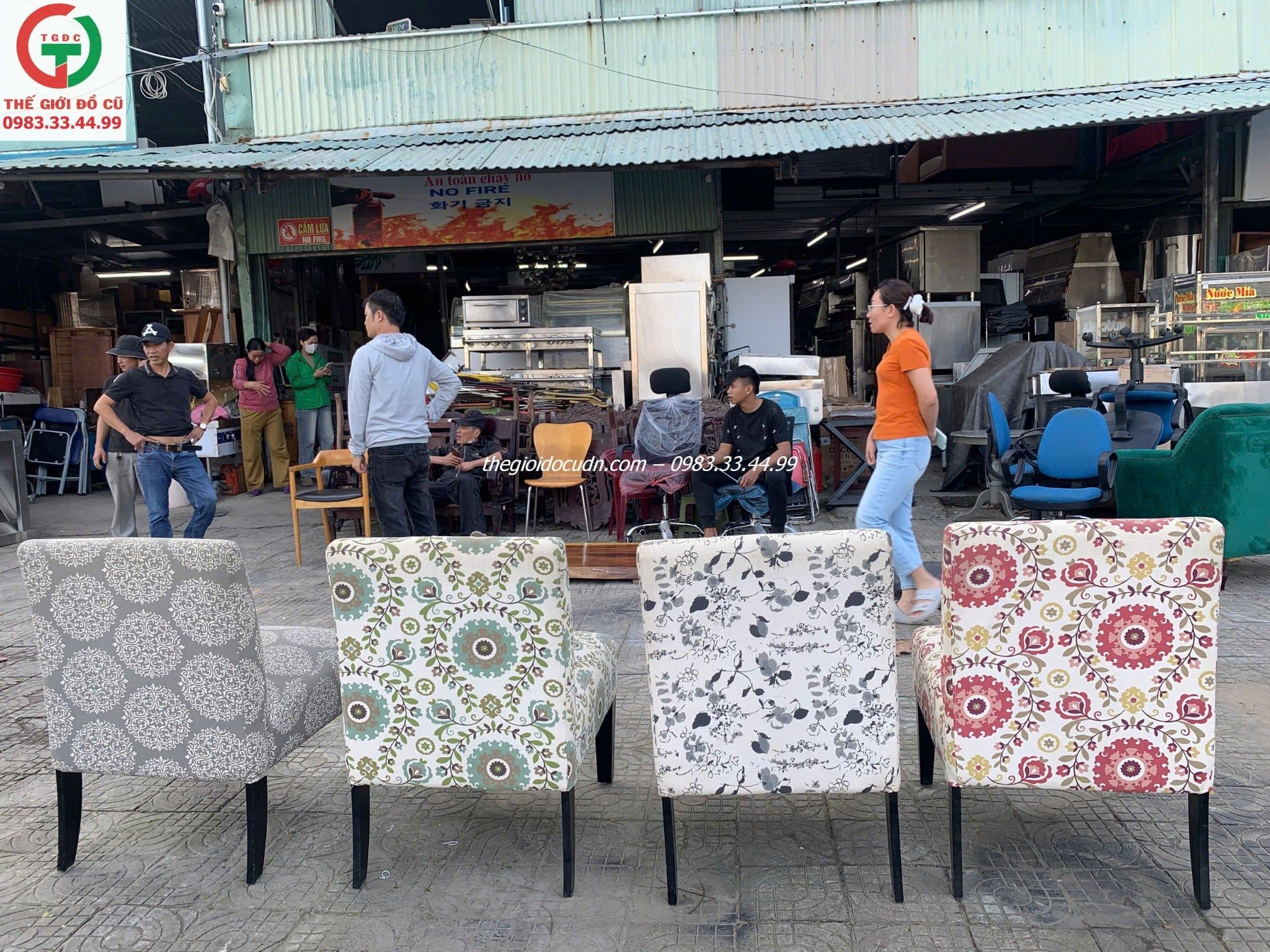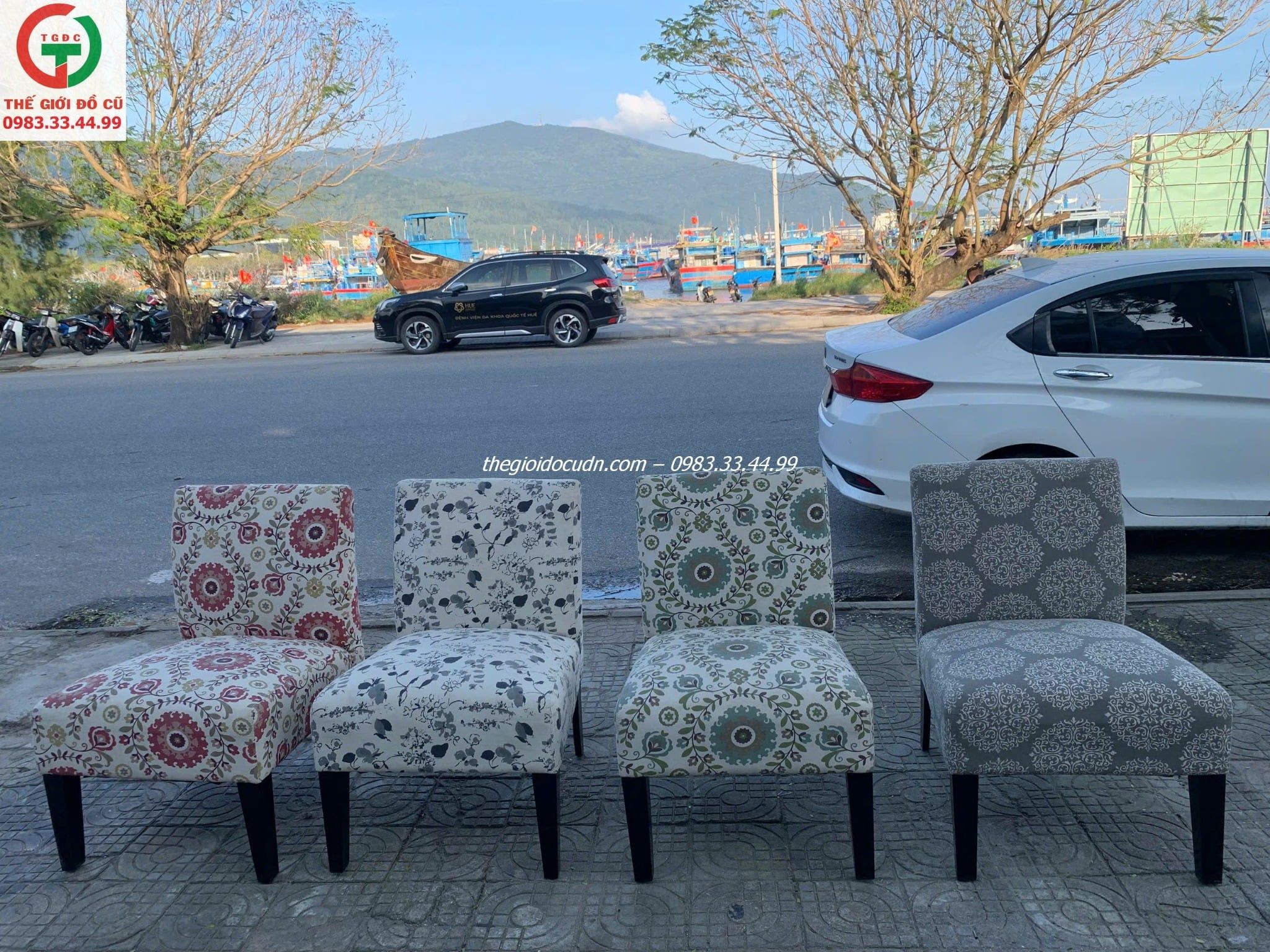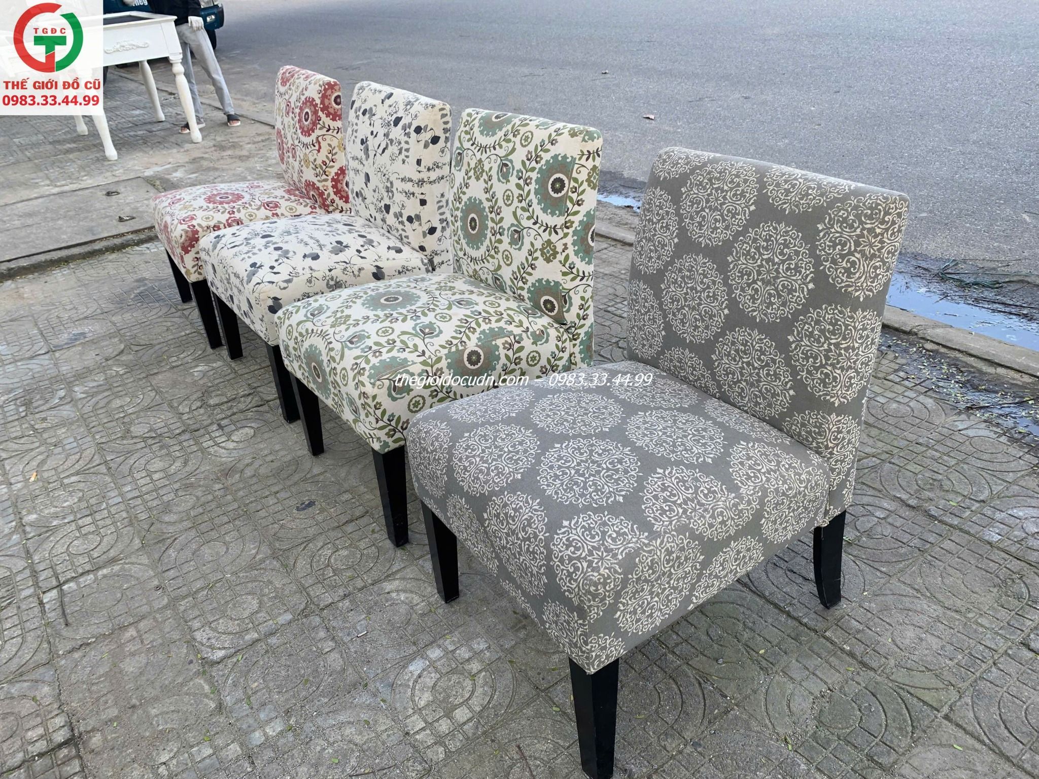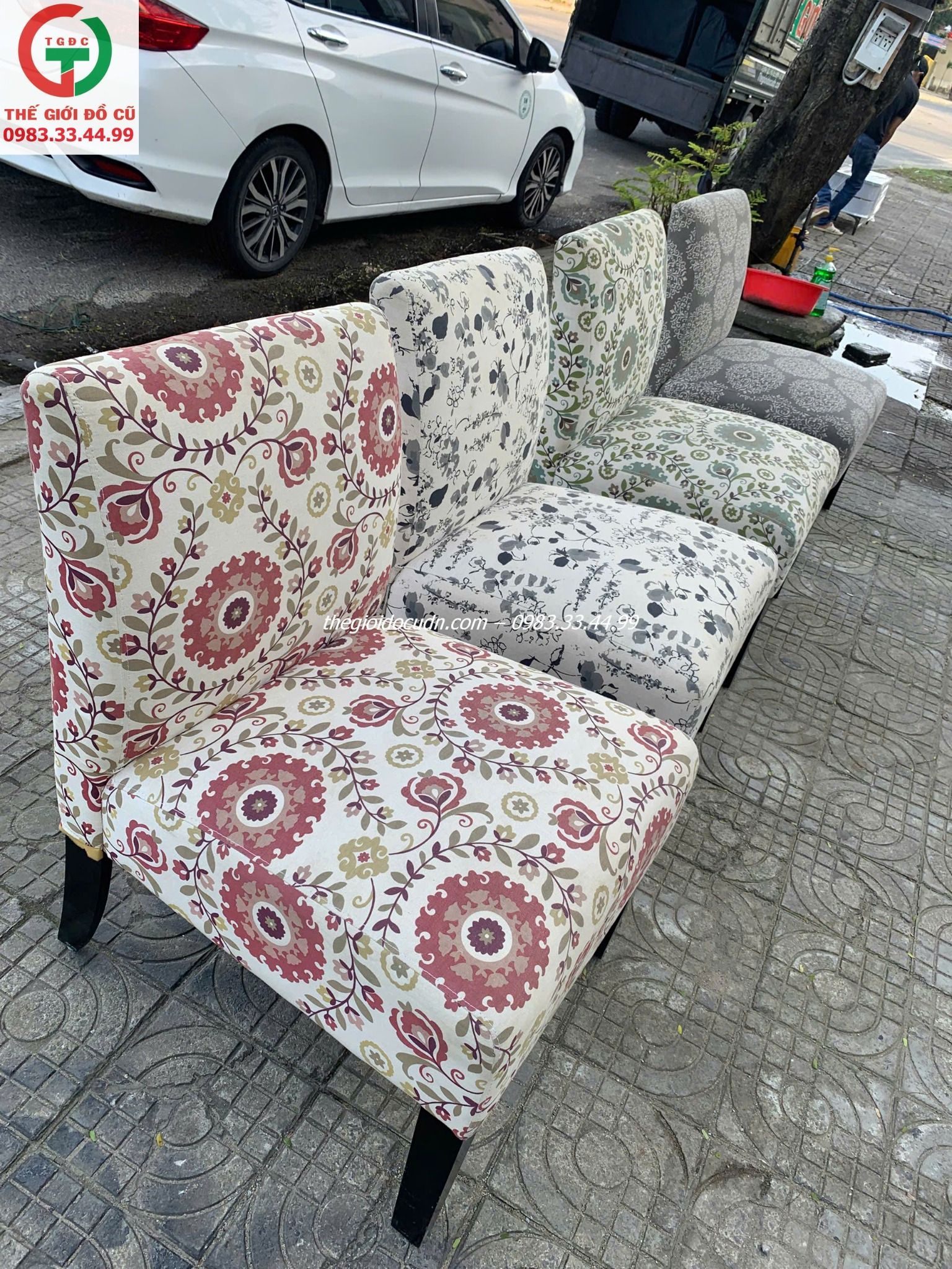 Thanh lý một soó ghế nệm đơn khung gỗ bọc vải hoa văn sặc sỡ phong phú, thich hợp decol quán xá, spa,...