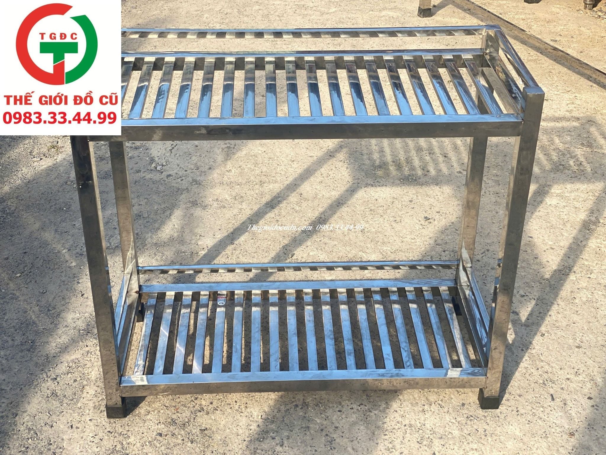 - Kệ inox dày cứng, 2 tầng, các song khít, có chắn để đồ không bị rớt.