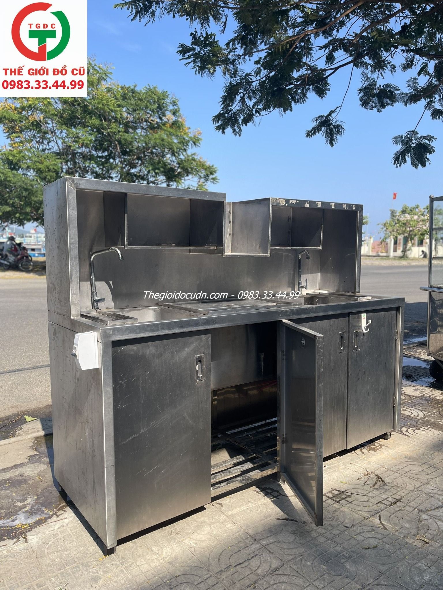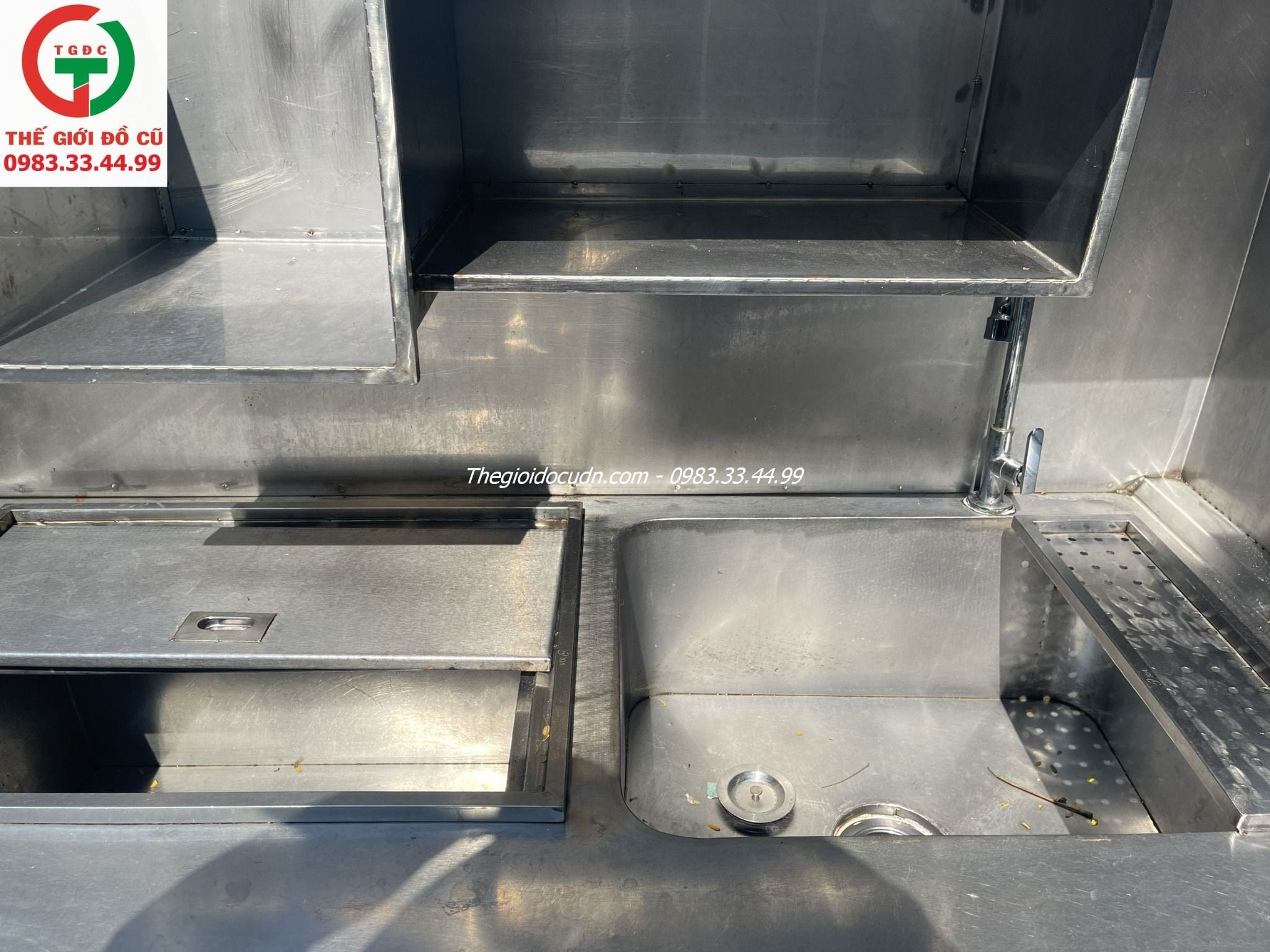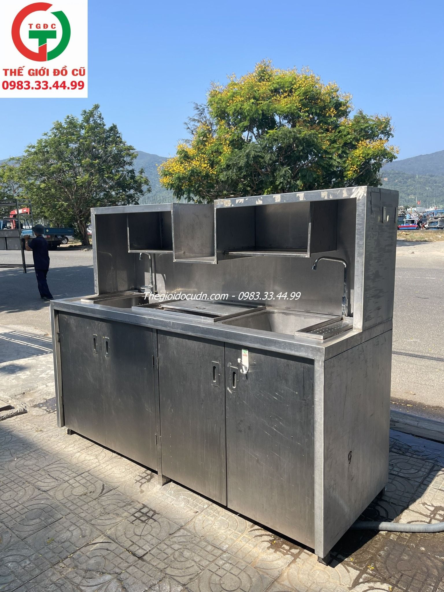 Thanh lý Quầy Pha Chế Inox liền kệ 2 bồn rửa 1 ngăn đá, tủ 4 cánh còn mới tầm 90%, sạch sẽ tiện lợi cho quán xá, nhà hàng..