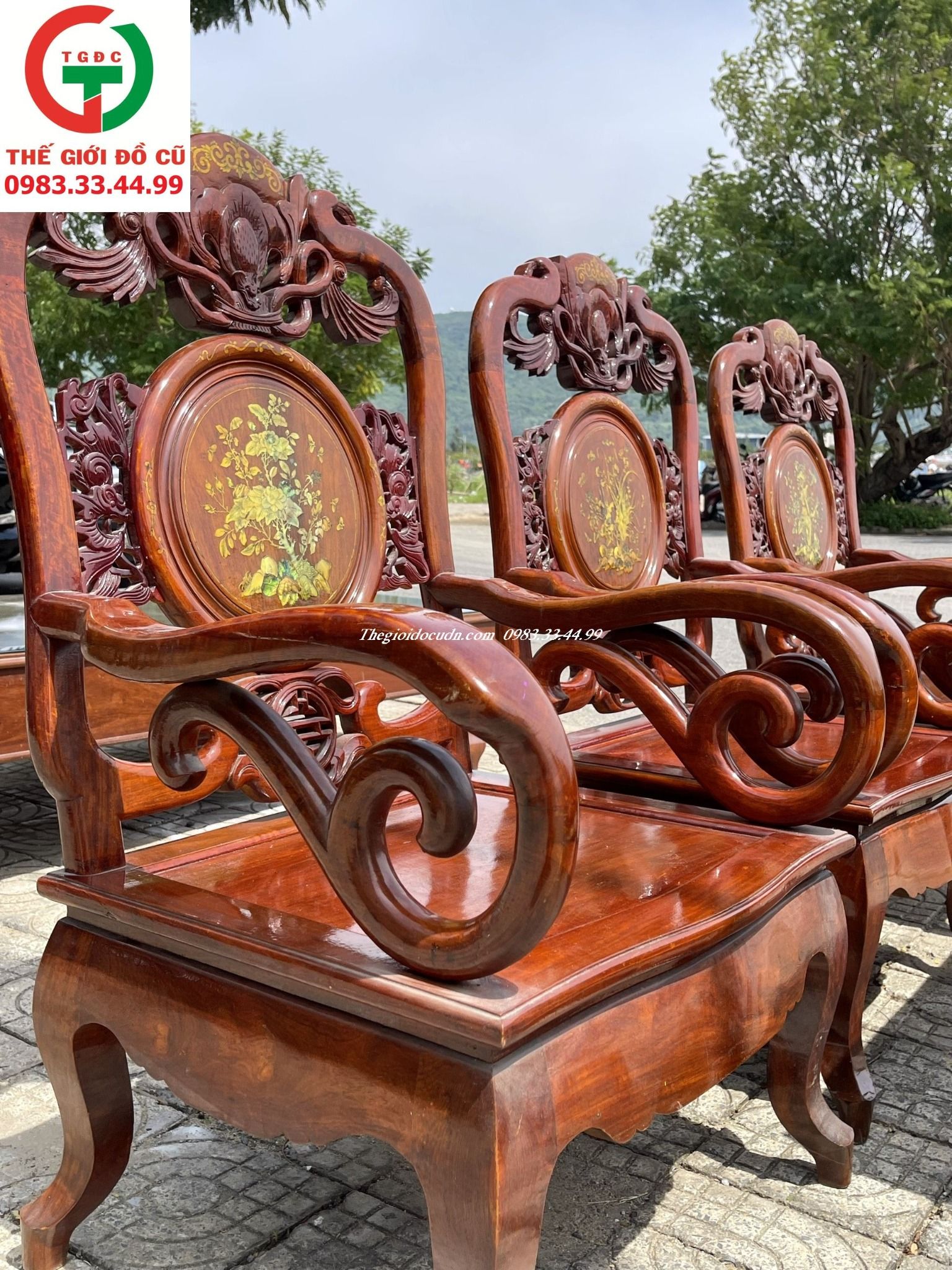 Thanh lý Bộ Salon gỗ hương việt 5 món còn mới keng bóng, chạm cẩn hoa văn rõ nét sang xịn.