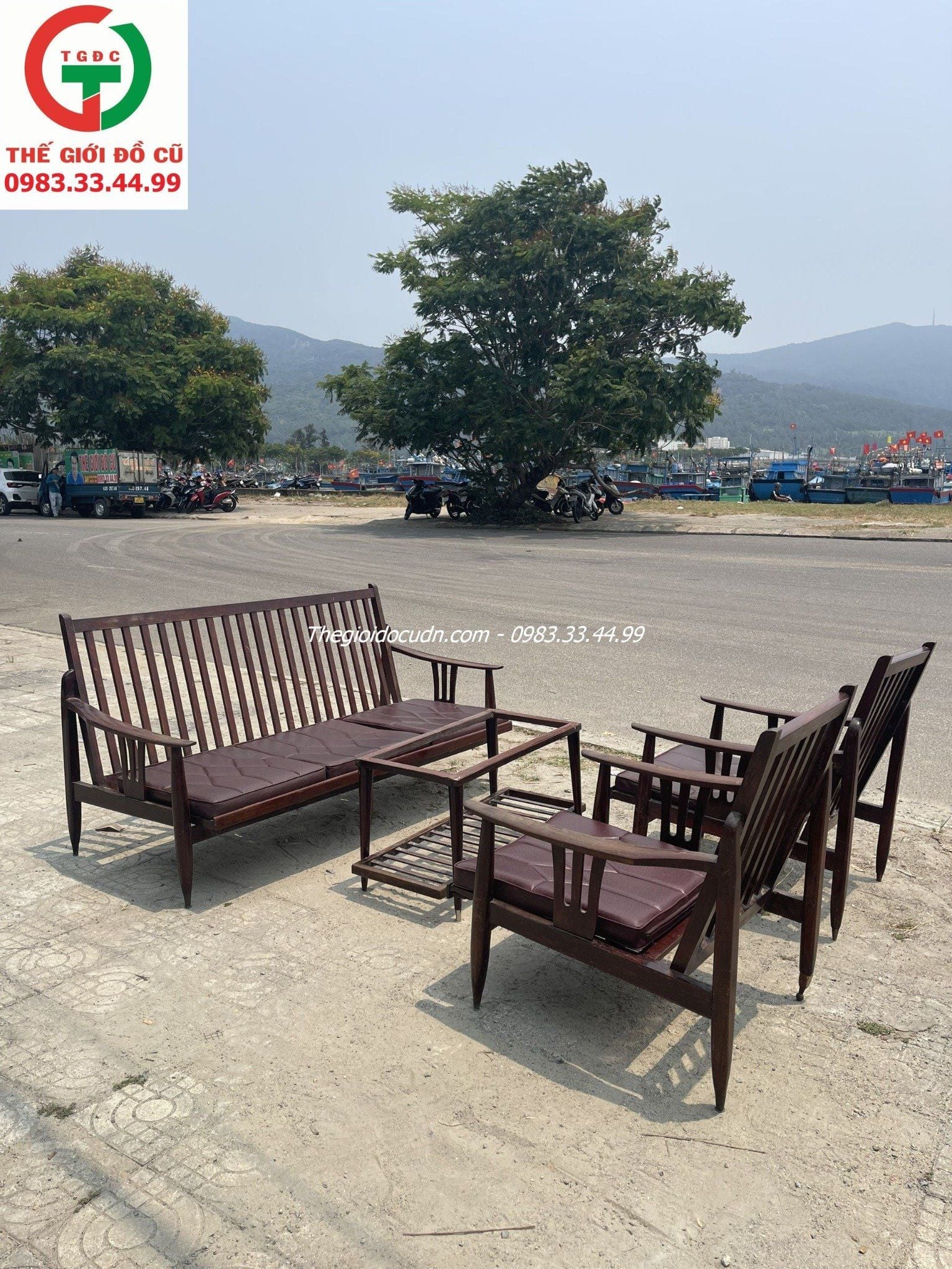 Thanh lý Bộ Salon Gỗ nan chân đồng xưa, ghế sẵn kèm đệm lót da ngồi êm, bàn ghế còn chắc cứng. Decor quán cafe vintage, nhà xưa, không gian ngồi thư giãn uống trà sân vườn đẹp chất.