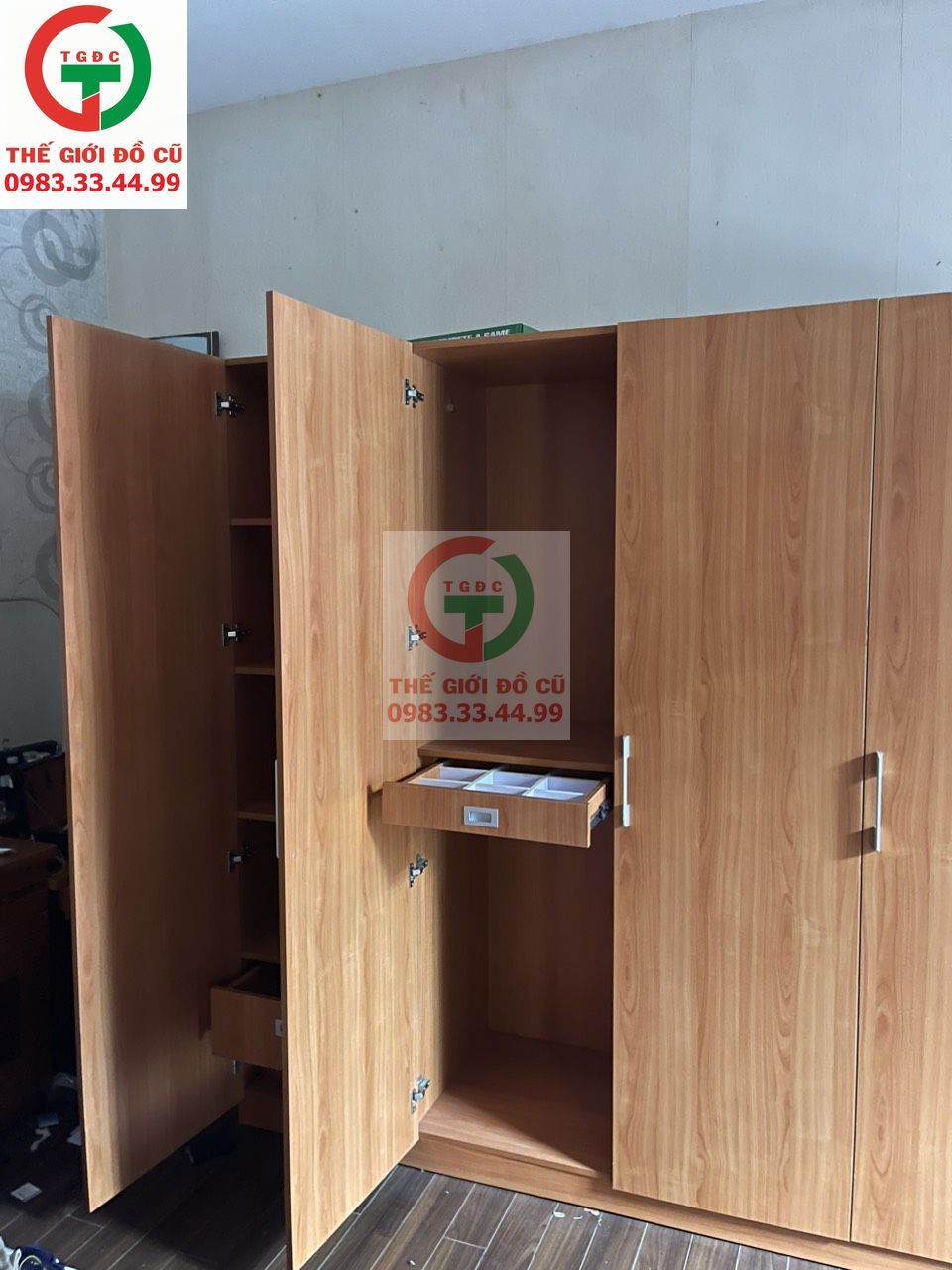 Thanh lý Tủ Áo Quần Gỗ MDF lõi xanh 4 cánh còn mới đẹp cứng, ngăn hộc to rộng tay cầm chắc chắn.