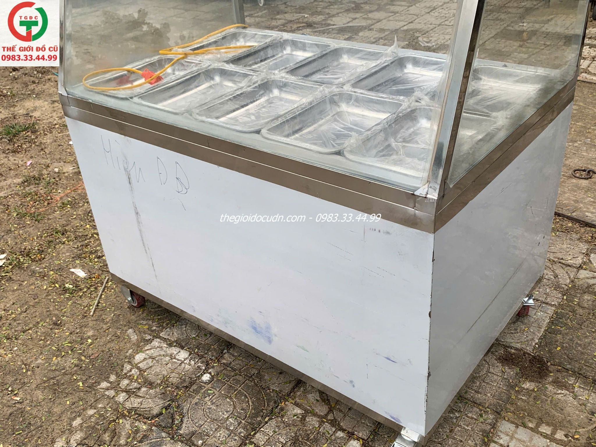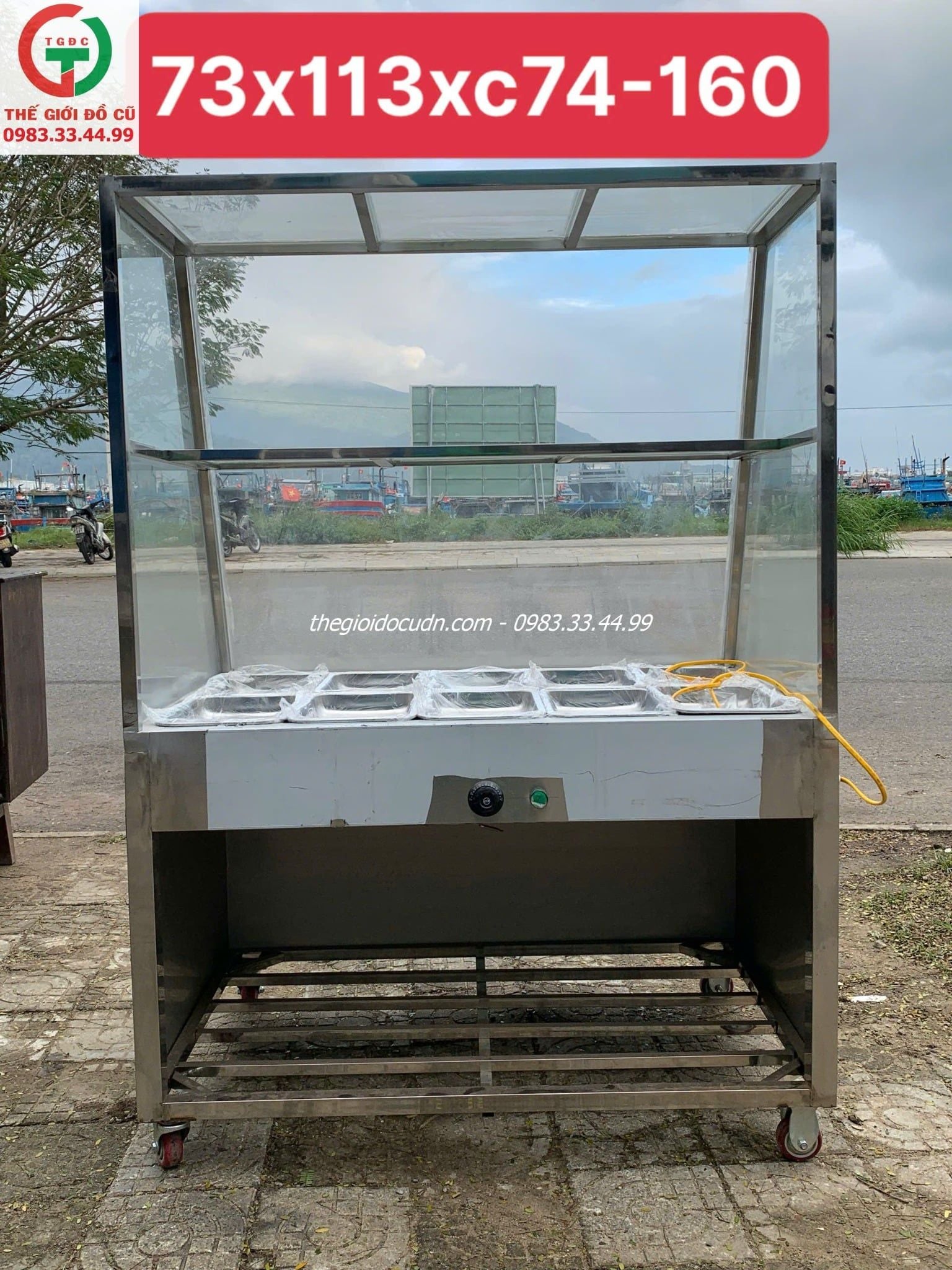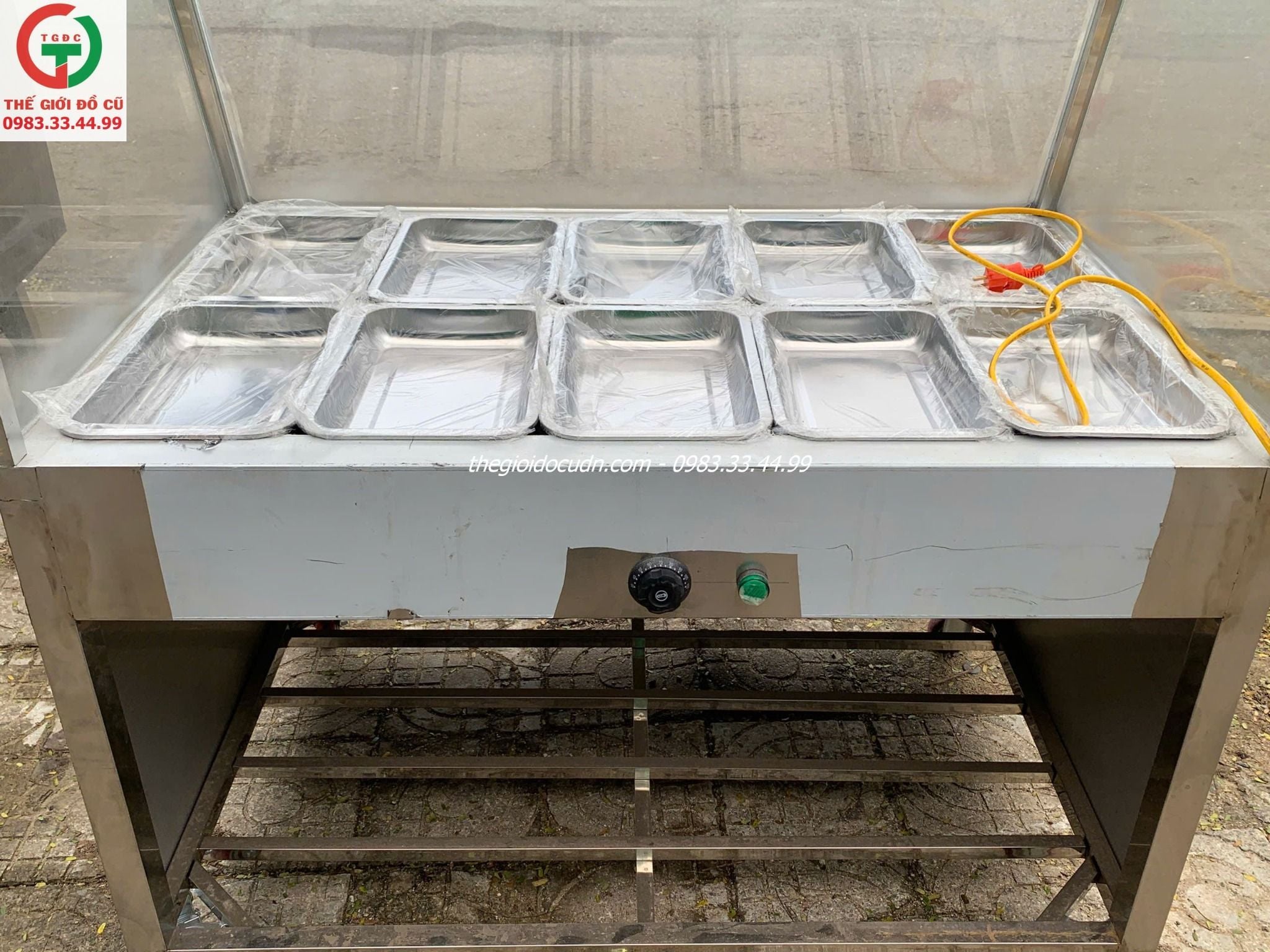 ++Tủ bán cơm inox có chế độ hâm nóng tại chỗ, nhiều khay topping để thức ăn tiện sạch.
