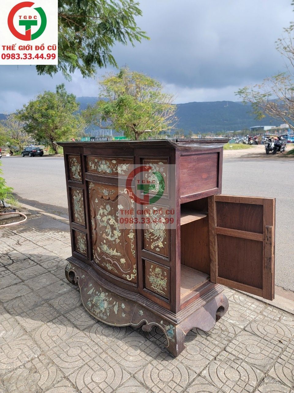 Thanh lý Tủ Thờ gỗ cẩn đẹp chắc xịn, sử dụng bền bỉ, có hộc tủ bên tiện lợi đặt để đồ dụng cụ phòng thờ tiện gọn.